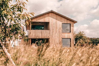 Das Ferienhaus Schmidhuber wurde 2019 als moderner Holzbau neu errichtet. Die klare, scheunenartige Form fügt sich in die ländliche Umgebung ein; im Inneren entsteht durch große Fensterflächen, Holzoberflächen und ausgewählte Möbel eine ruhige, wertige Atmosphäre.